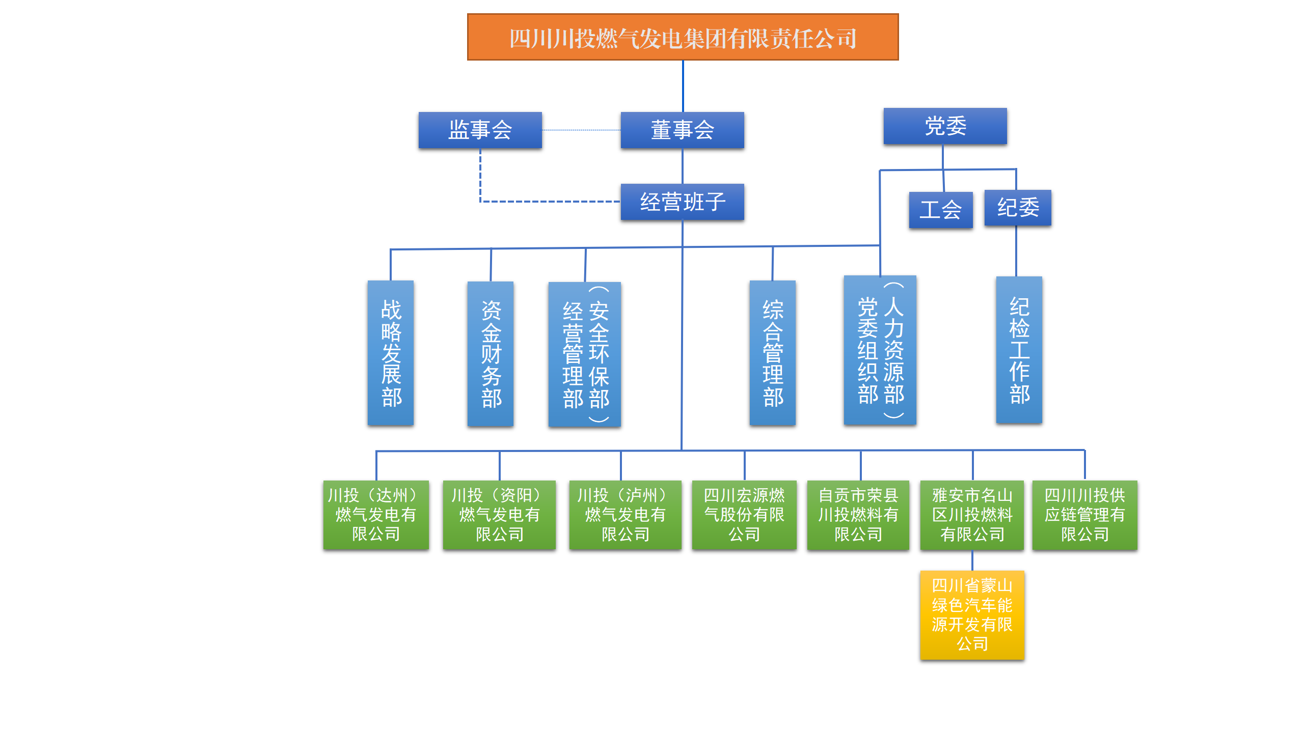 根据燃气发电产业整合及战略发展定位,按照“小总部、大产业”的集团型管控模式设置公司组织架构,四川川投燃气发电集团有限责任公司设立董事会、监事会,公司设立党委、纪委,同步设立党委组织部(人力资源部)、纪检工作部,经营层下设综合管理部、战略发展部、资金财务部、经营管理部(安全环保部)等4个职能部门。