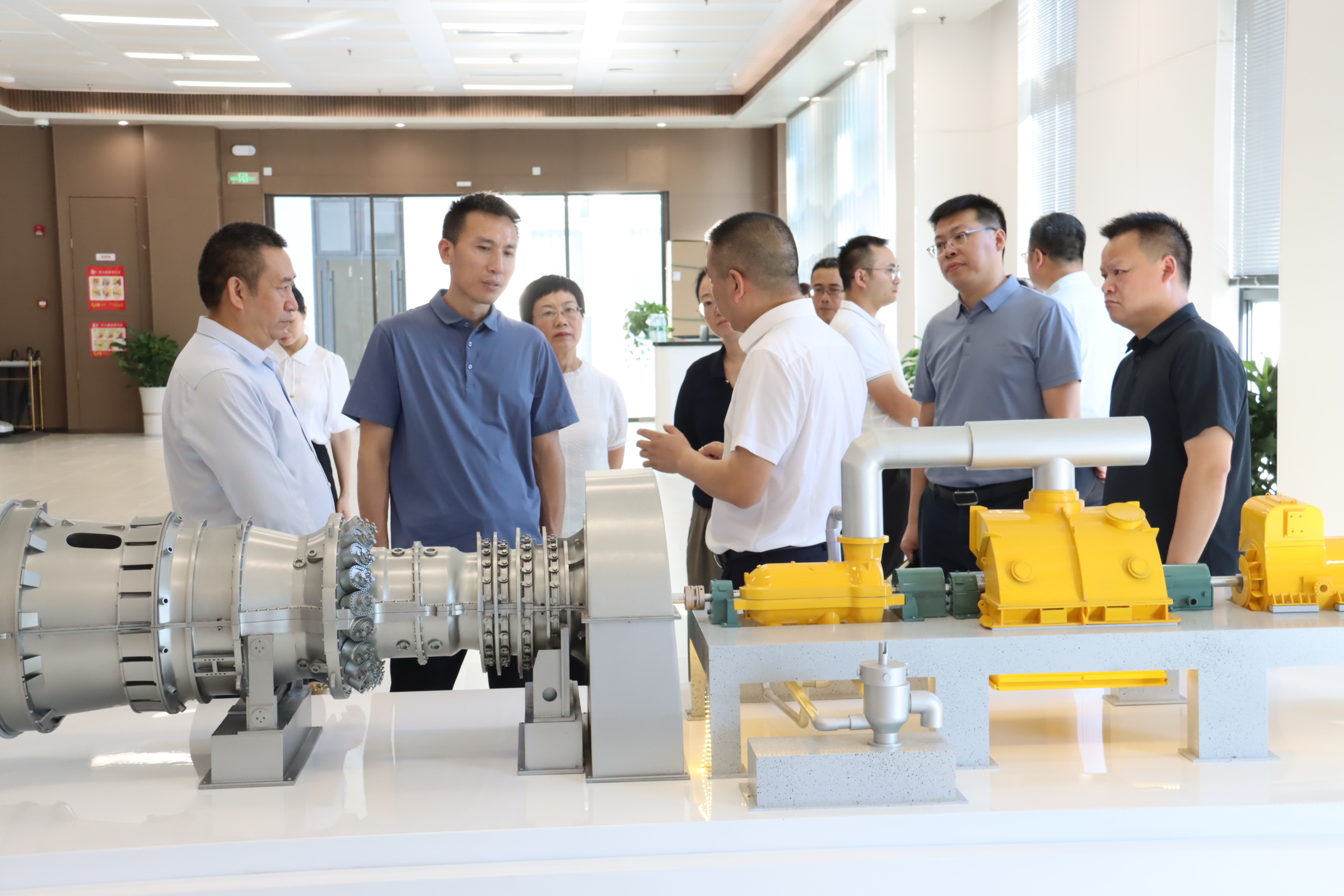 在一楼展示厅,张能坤一行详细了解了资阳燃气电站项目基本概况、燃气发电产业优势、H级燃机机组特性等方面情况;在智慧管控中心,张能坤一行实地查看机组运行情况,听取了资阳气电在迎峰度夏电力保供方面的工作情况汇报。