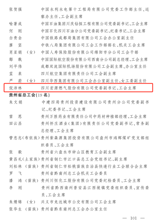 近日,中华全国总工会印发《关于表彰全国模范职工之家 全国模范职工小家 全国优秀工会工作者的决定》。四川川投燃气发电集团有限责任公司(以下简称川投燃电)所属四川宏源燃气股份有限公司(以下简称宏源气司)党委副书记、职工董事、工会主席倪沛林获评全国优秀工会工作者。