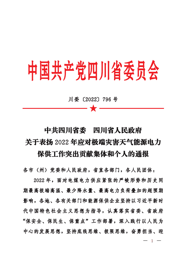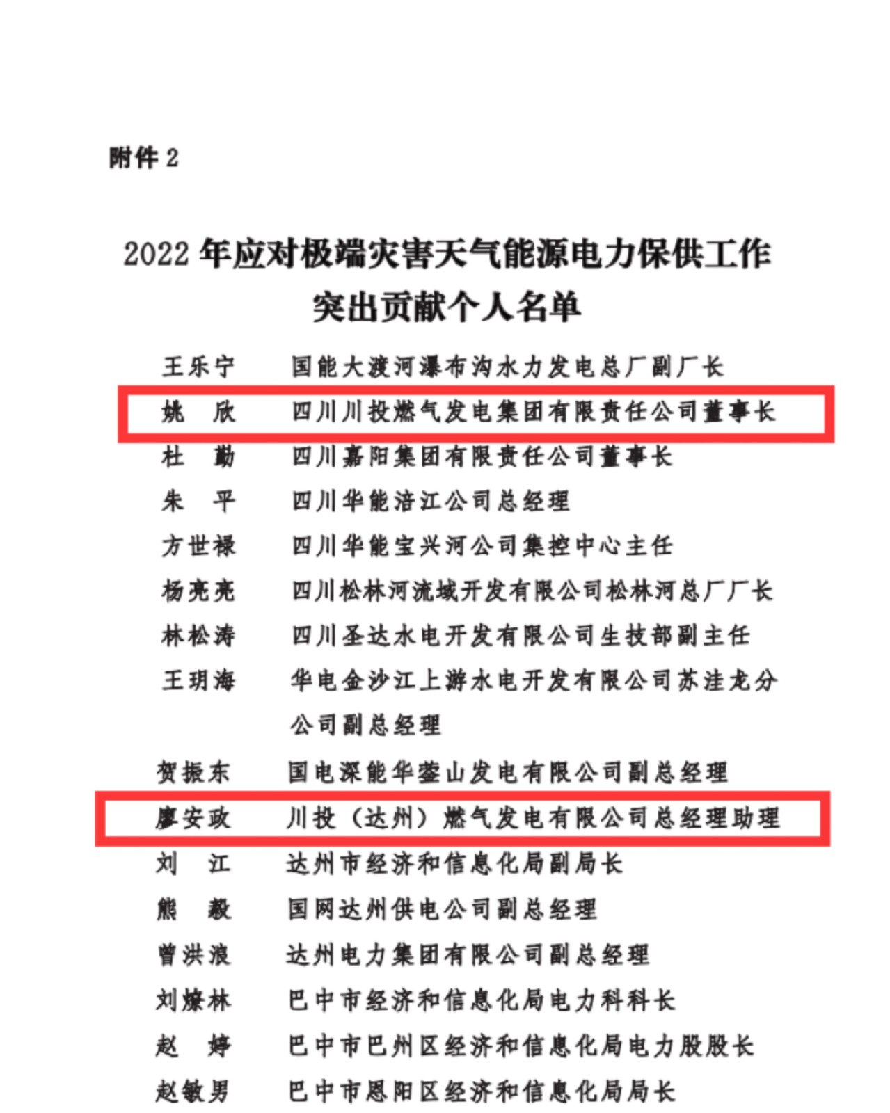 2022年12月31日,中国共产党四川省委员会发布《关于表扬2022年应对极端灾害天气能源电力保供工作突出贡献集体和个人的通报》(川委〔2022〕796号),川投燃电集团党委书记、董事长姚欣、达州气电公司总经理助理廖安政荣获“2022年应对极端灾害天气能源电力保供工作突出贡献”奖。这是省委、省政府对川投燃电集团能源保供工作的高度肯定。