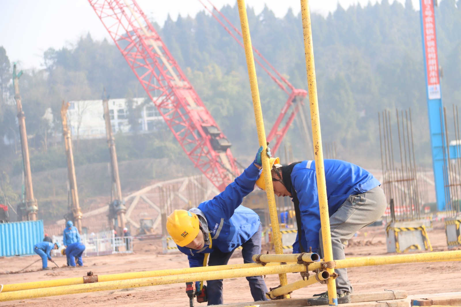 以安全为保障,项目建设快速“复位”。截止1月29日,项目已有200余人返岗复工。主厂房结构施工、环形道路铺设、桩基施工、锅炉安装、取水管道作业等工作全面铺开,挖掘机、铲车、工程运输车、塔吊等大型机械“轰轰隆隆”,项目现场一片热火朝天的景象,确保项目建设攻坚年实现“开门红”。
