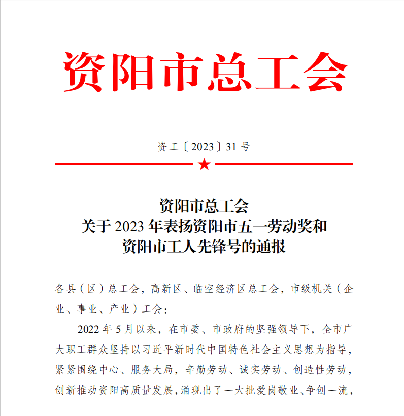 4月26日,资阳市总工会发布《关于2023年表扬资阳市五一劳动奖和资阳市工人先锋号的通报》(资工〔2023〕31号),资阳气电荣获资阳市五一劳动奖(集体类)。