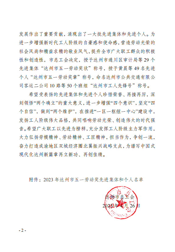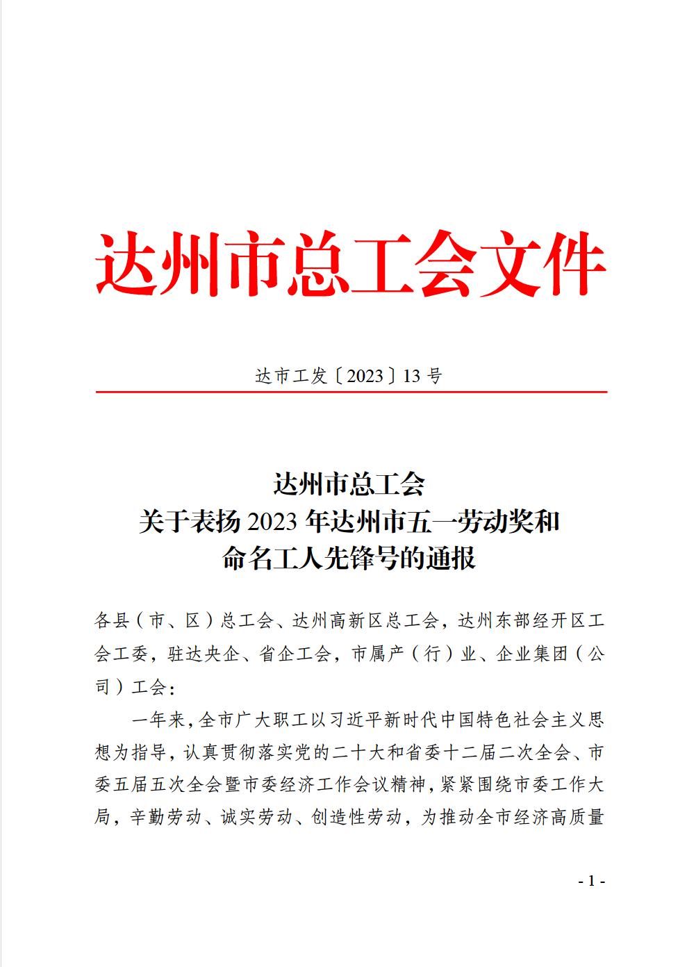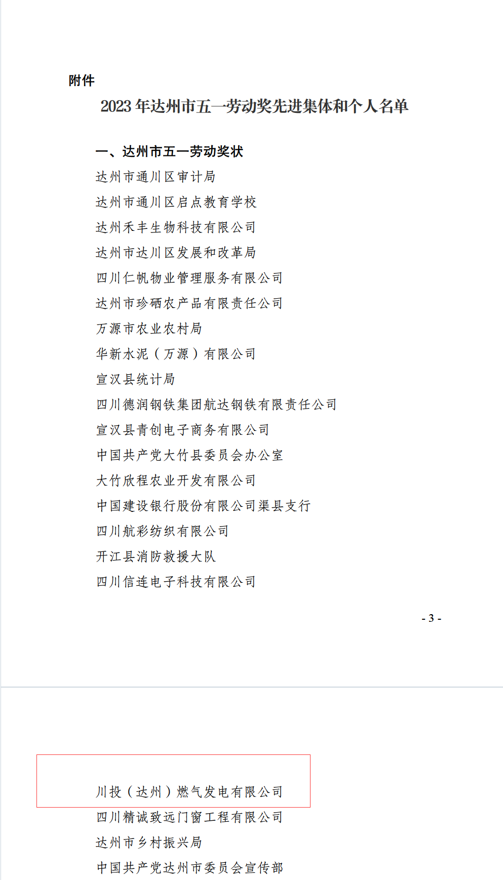 4月26日,根据达州市总工会《关于表扬2023年达州市五一劳动奖和命名工人先锋号的通报》(达市工发〔2023〕13号),达州气电荣获达州市五一劳动奖。