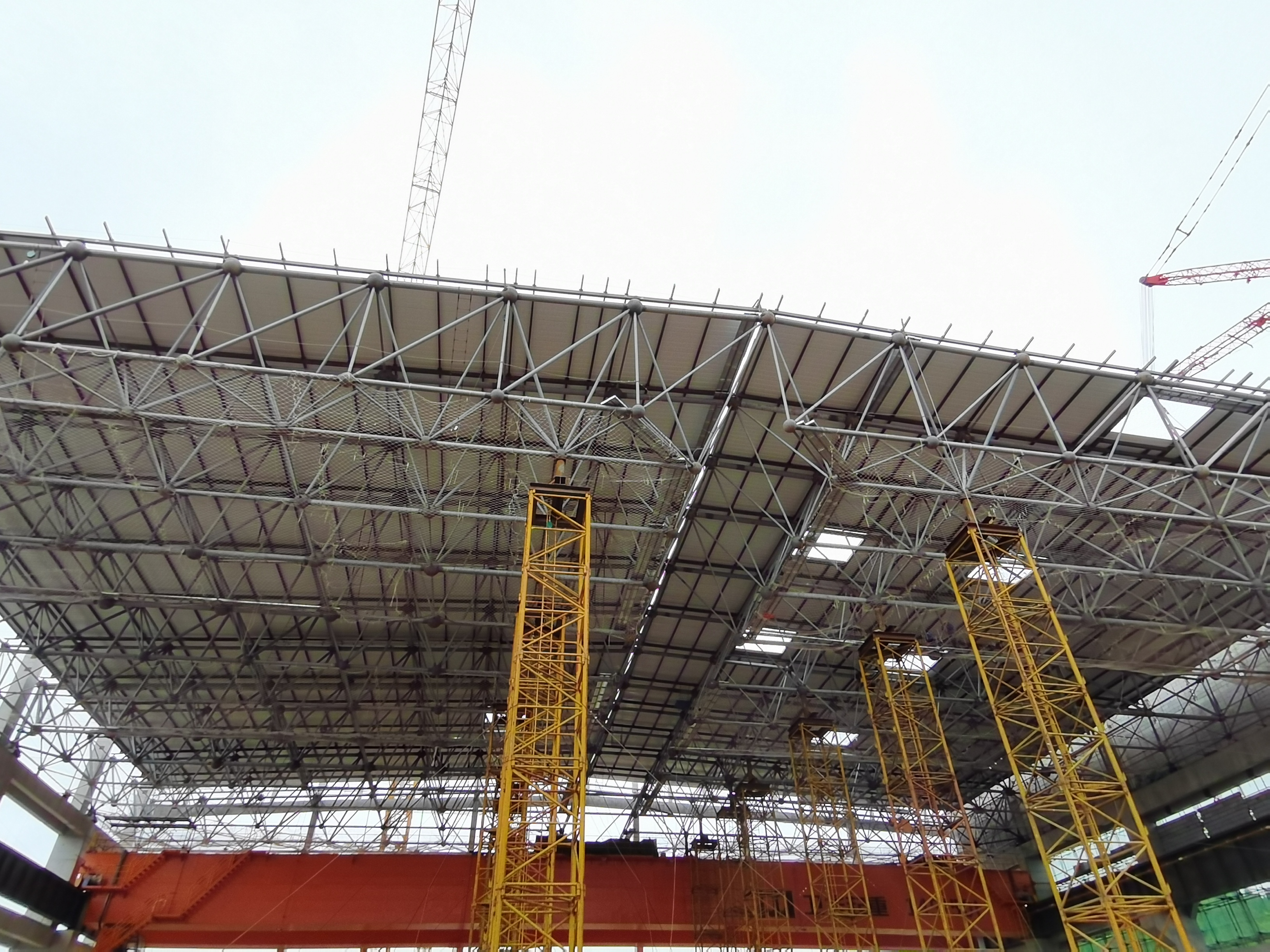 资阳燃气电站主厂房屋面网架标高位于31.65m,主要由焊接球、圆管组成,共分16个分块组合安装,1号机组安装1-8号分块。为确保按时完成止水节点目标任务,参建单位成立专班小组,组建组合队、吊装队、焊接队、拼板队等四个施工小队,现场设置4个组合场、1个拼装场。作业期间,专班小组统一协调,明确各小队分工,科学规划作业顺序,做实做细高空作业安全技术交底和各项措施,确保安装工作有序推进。资阳气电、项目监理部专人全程跟踪施工作业过程,牢牢把握安全、质量两个核心,确保安装质量;参建各方克服了近期暴雨天气、高温暑热等不利因素,高质量完成了止水工作。