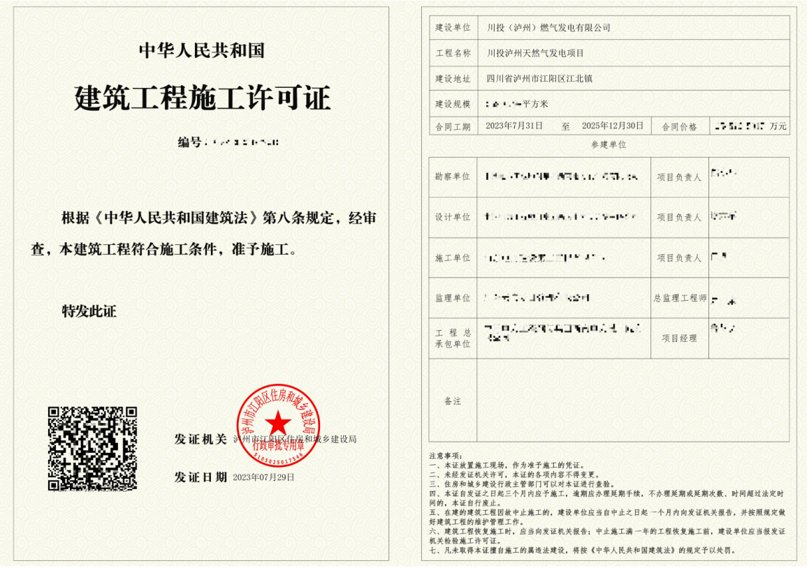 继7月27日取得建设用地土地产权证书、建设用地规划许可证及建设工程规划许可证后,7月29日,川投泸州天然气发电项目再次取得重要进展,顺利取得项目施工许可证。至此,项目已具备开工所需的全部法定条件,正式迈入全面建设“快车道”。