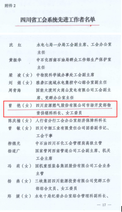 近日,“四川省工会系统先进集团和先进工作者”获评名单公布,川投燃电所属宏源气司市场开发部物资供销科科长、工会女工委员曾艳被授予“四川省工会系统先进工作者”荣誉称号。