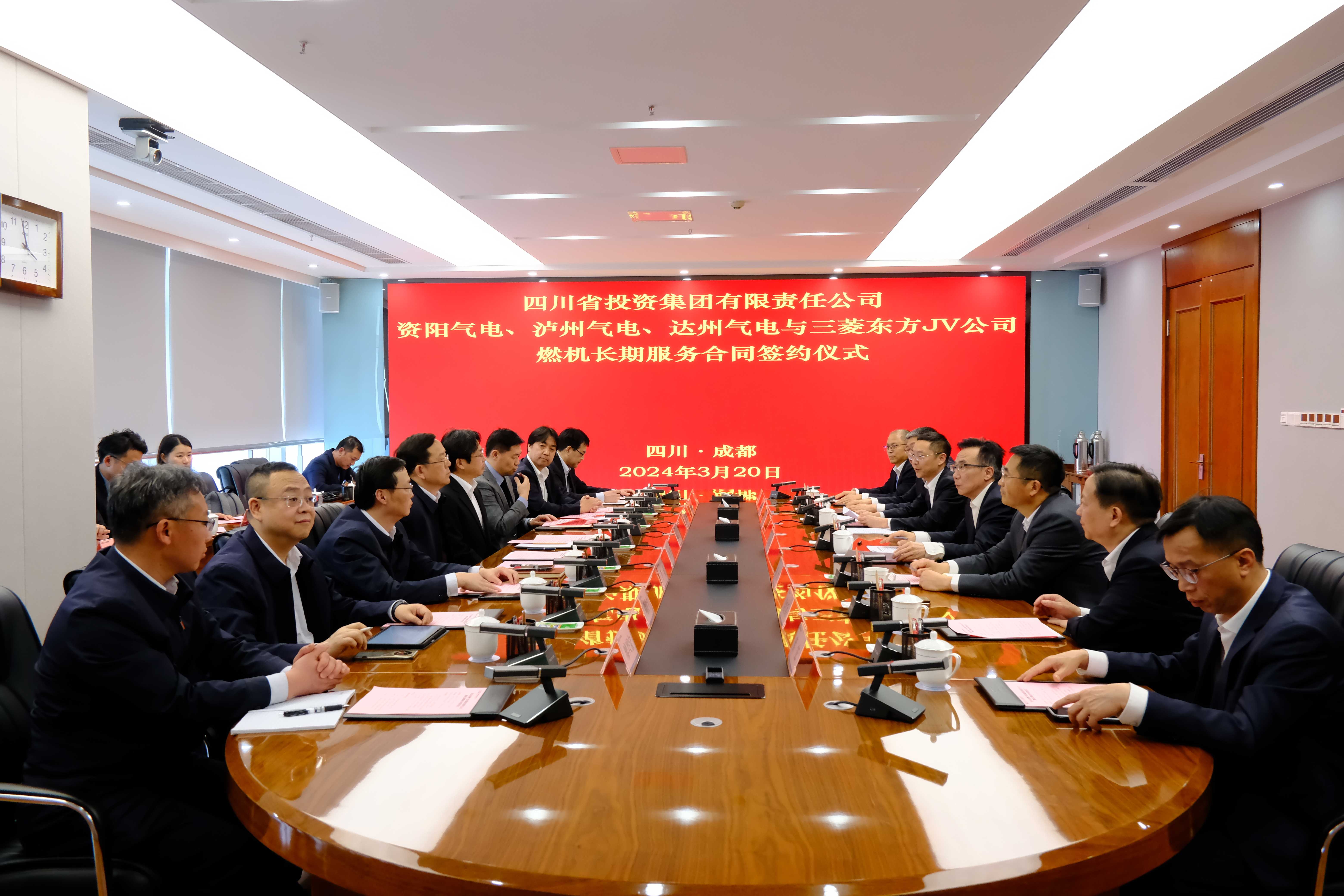 为积极贯彻落实全省电源电网发展规划决策部署,在川投集团的领导下,川投燃电在确保目前全省唯一在运燃电项目达州气电(一期)的持续安全运营基础上,正全力推进资阳、泸州、达州(二期)三大燃电项目建设。为确保项目按期投产发电并持续安全运营,3月20日,川投燃电所属资阳气电、泸州气电、达州气电三家公司与三菱重工东方燃气轮机(广州)有限公司(以下简称“三菱东方JV公司”)在成都正式签订燃机长期服务合同。川投集团党委书记、董事长吴晓曦,东方电气集团东方汽轮机有限公司党委书记、董事长刘辉,三菱重工业株式会社燃机事业部售后服务总负责川口高广,三菱东方JV公司总经理川上正尚,川投燃电党委书记、董事长姚欣,党委副书记、总经理邓锐等出席签约仪式。