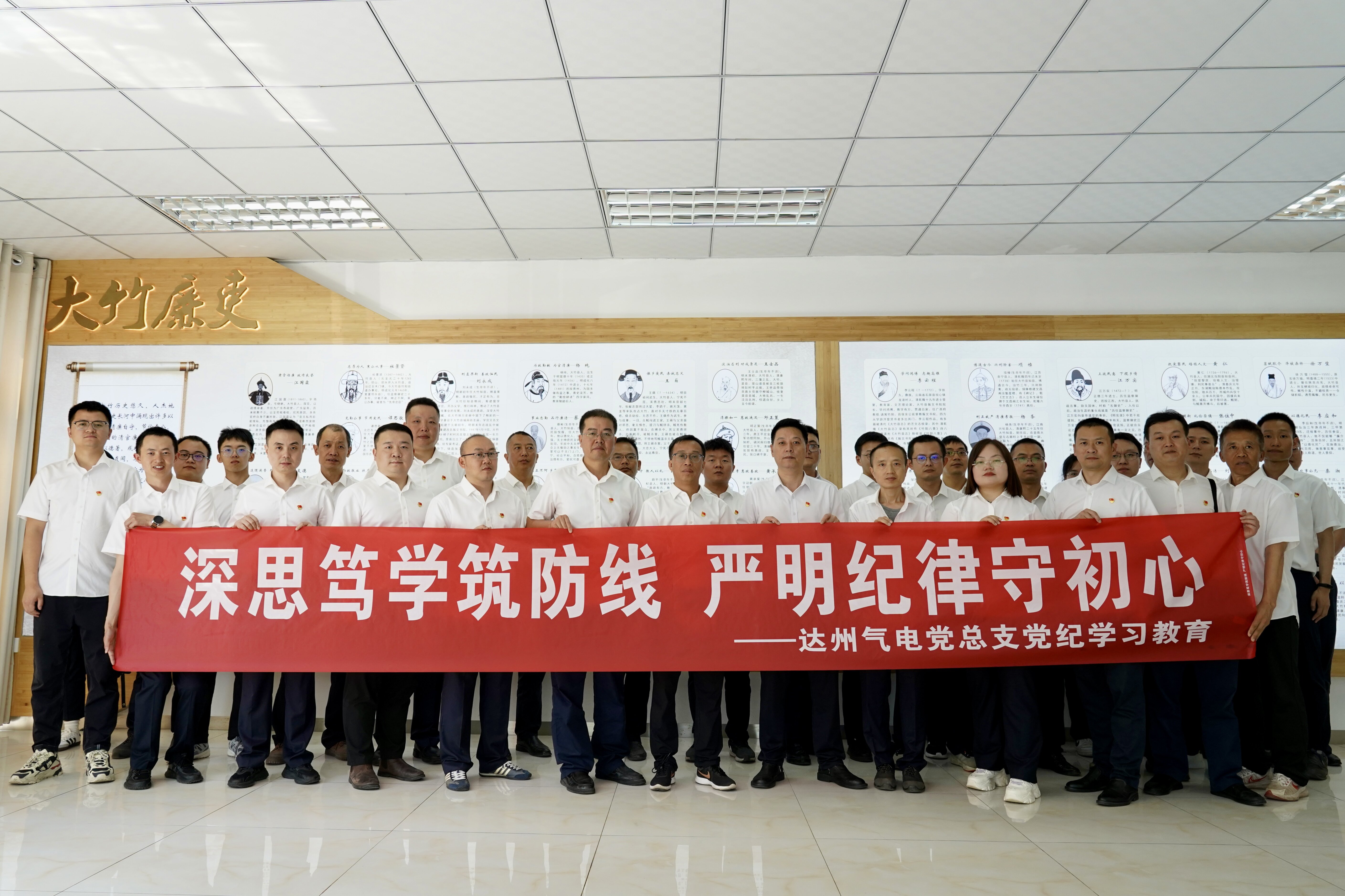 为推进党纪学习教育走深走实,强化党员同志守纪律、讲规矩的政治意识,教育引导党员干部从思想上正本清源、固本培元,营造勤勉务实、清正廉洁的发展氛围。6月25日,公司党总支组织全体党员及入党积极分子,赴大竹竹廉馆开展党纪学习教育主题党日活动。