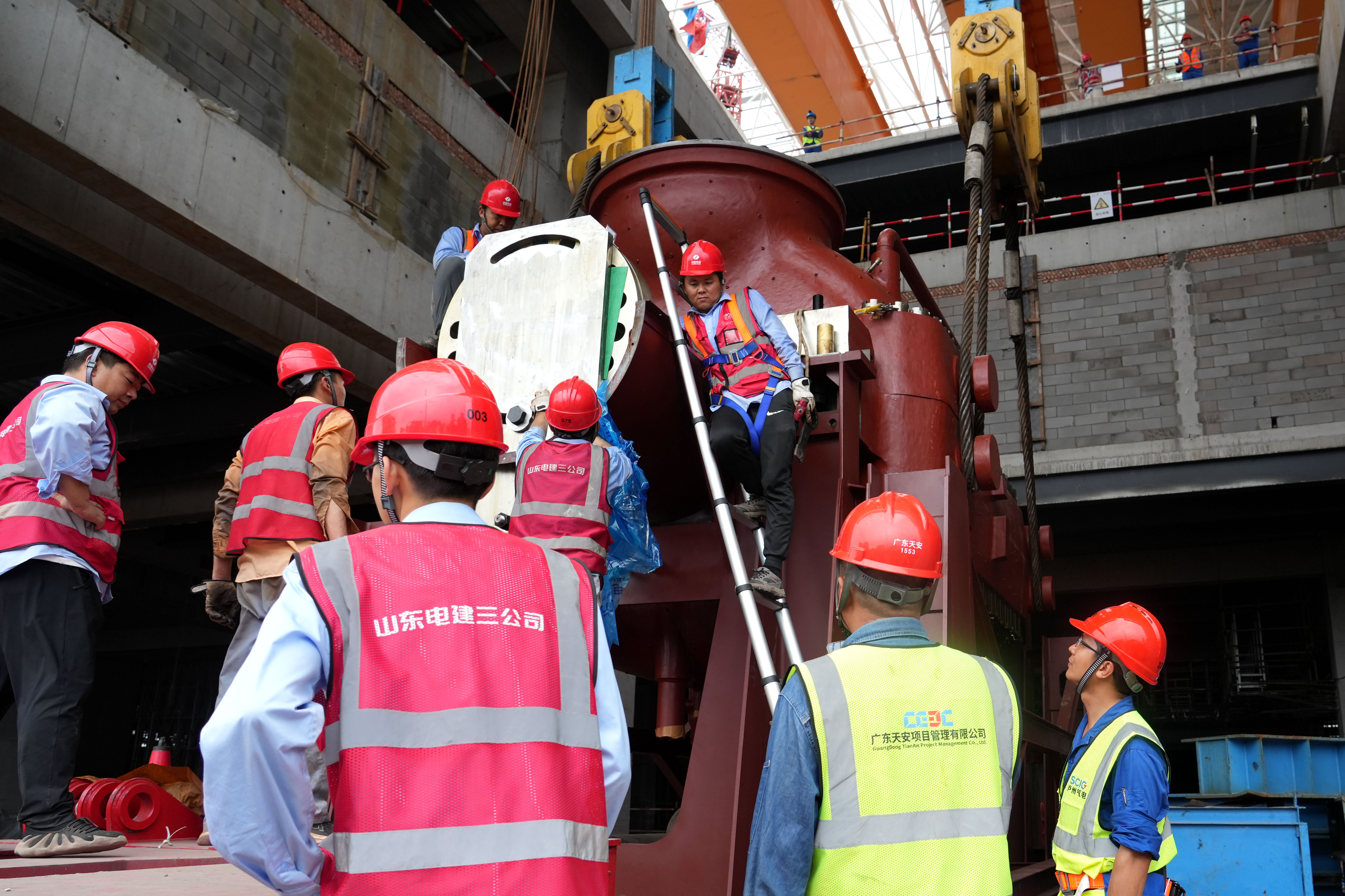 项目汽轮机部分高中压缸采用模块化设计,长8.9米、宽3.7米、高4.5米,重170吨,现场采用两台行车和液压提升装置联合吊装方式进行吊装。