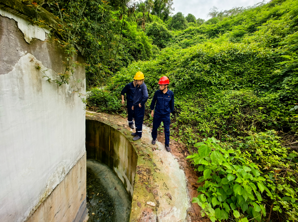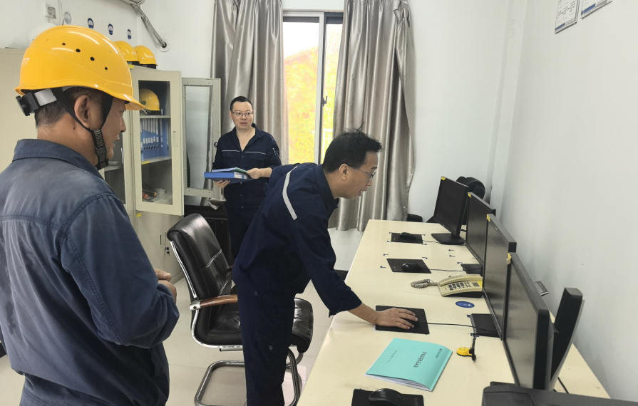 “排洪沟有没有淤积?设备运行参数是否正常?”检查组首站抵达取水泵房——作为公司防汛“重中之重”,蔡宏一行直奔后山排洪沟,沿沟徒步查看排水通畅情况,仔细检查沟体有无破损、堵塞;随后深入泵房坑底,俯身查看水泵机组、供电线路运行状态,逐项核对仪表数据,确保设备处于安全工况;同时驻足江边,结合近期水文记录,现场研判洪水水位变化趋势,分析潜在风险。