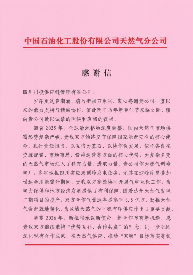 近日,中国石油化工股份有限公司天然气分公司向四川川投供应链管理有限公司发来感谢信,对其2025年在天然气保供、资源协同及战略合作等领域的突出贡献给予高度赞誉和诚挚感谢。