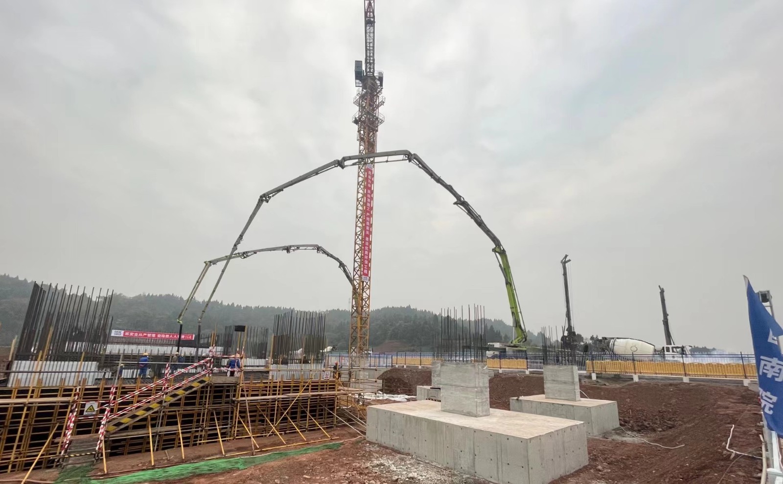 #2机岛基础底座浇筑砼强度等级为C35,一次性整体浇筑混凝土2715方,是继12月11日#1机岛基础底座浇筑后的又一个大体积混凝土浇筑。本次混凝土浇筑使用了3台泵车及21台混凝土运输车,用以保障大体积混凝土连续浇筑。整个浇筑过程充分吸取了#1机岛基础底座浇筑经验,参建单位在交通、通讯、物资、人员、机械、后勤等方面制定了一系列更完善措施,使得浇筑过程更顺畅,安全质量得到良好保证。