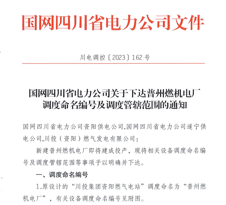 9月25日,资阳气电收到国网四川省电力公司下发的《国网四川省电力公司关于下达普州燃机电厂调度命名编号及调度管辖范围的通知》,川投集团资阳燃气电站调度正式命名为:“普州燃机电厂”。