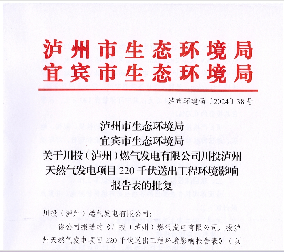 4月30日,《川投泸州天然气发电项目220千伏送出工程环境影响报告表》顺利通过泸州市生态环境局和宜宾市生态环境局联合审批,同意该工程按照环评报告书中所列环境保护污染防治措施及相关要求进行建设运行。至此,川投泸州天然气发电项目220千伏送出工程成功取得环评批复。
