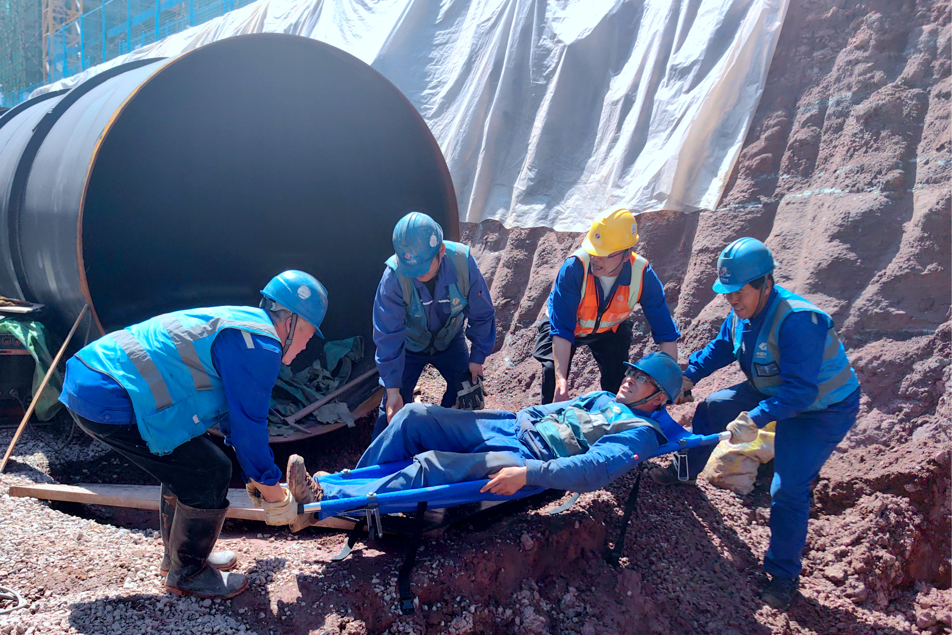 本次演练分为医疗、救援、后勤、善后4个小组,采用实战形式进行演练。演练模拟场景为:5月13日下午,施工现场骤降暴雨造成循环水泵房北侧的循环水管道基槽边坡发生局部塌方,塌方导致基坑下方一名作业人员和工器具被掩埋,循环水泵房基坑内流入大量积水,如不及时进行抽排可能导致基坑边坡浸泡发生大面积坍塌事故,需立即组织人员抢险。接到险情报警后,防汛应急指挥部迅速启动应急机制,第一时间组织应急救援队火速赶赴目标地点,按照防汛应急方案,着眼实战,进行了紧急救险、转移伤员、人员排查、积水抽排等应急救援。