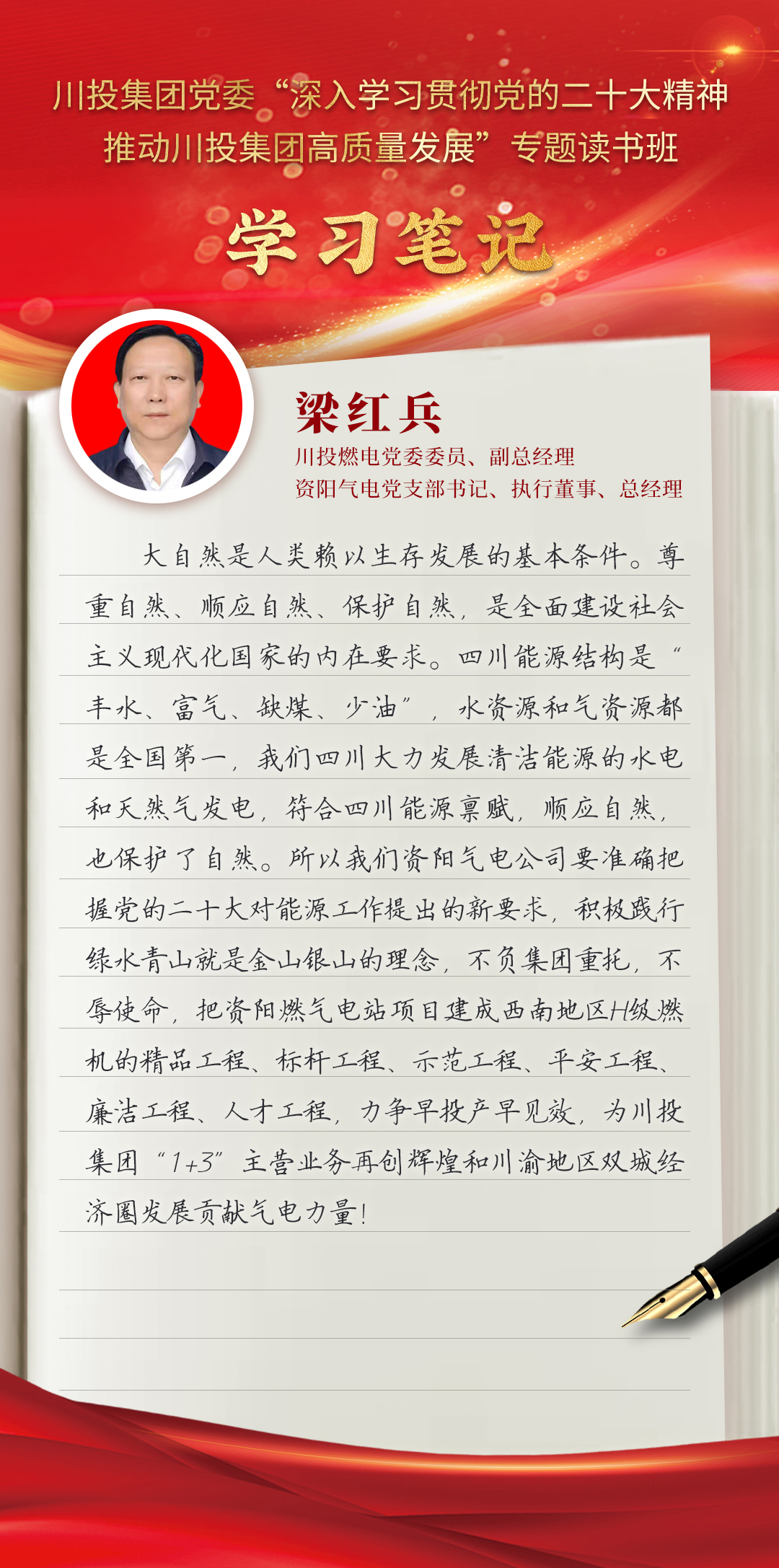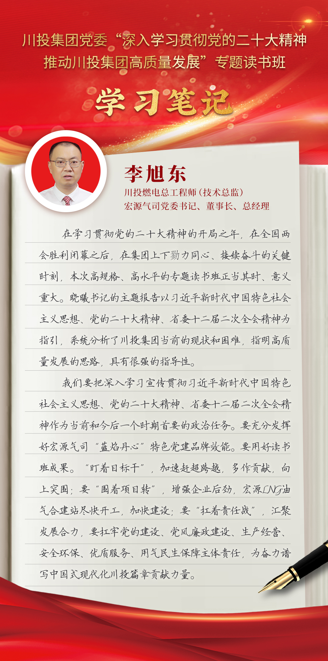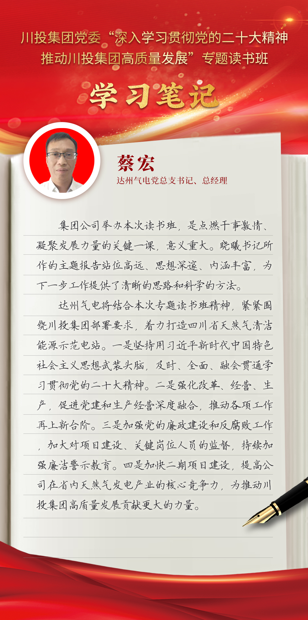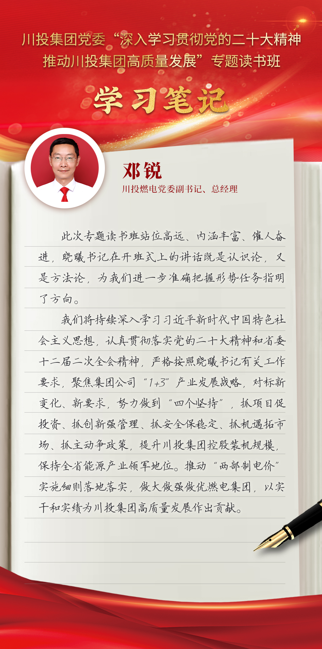 近期,川投集团党委举办了“深入学习贯彻党的二十大精神,推动川投集团高质量发展”专题读书班,吹响了推动川投集团高质量发展的”集结号”。来自川投燃电的学员认真学习、深入思考,他们的“学习笔记”,写下了收获与心得。